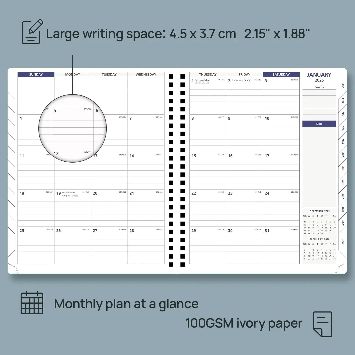 Monthly overview pages with a dedicated notes section help you see the bigger picture and set clear goals.