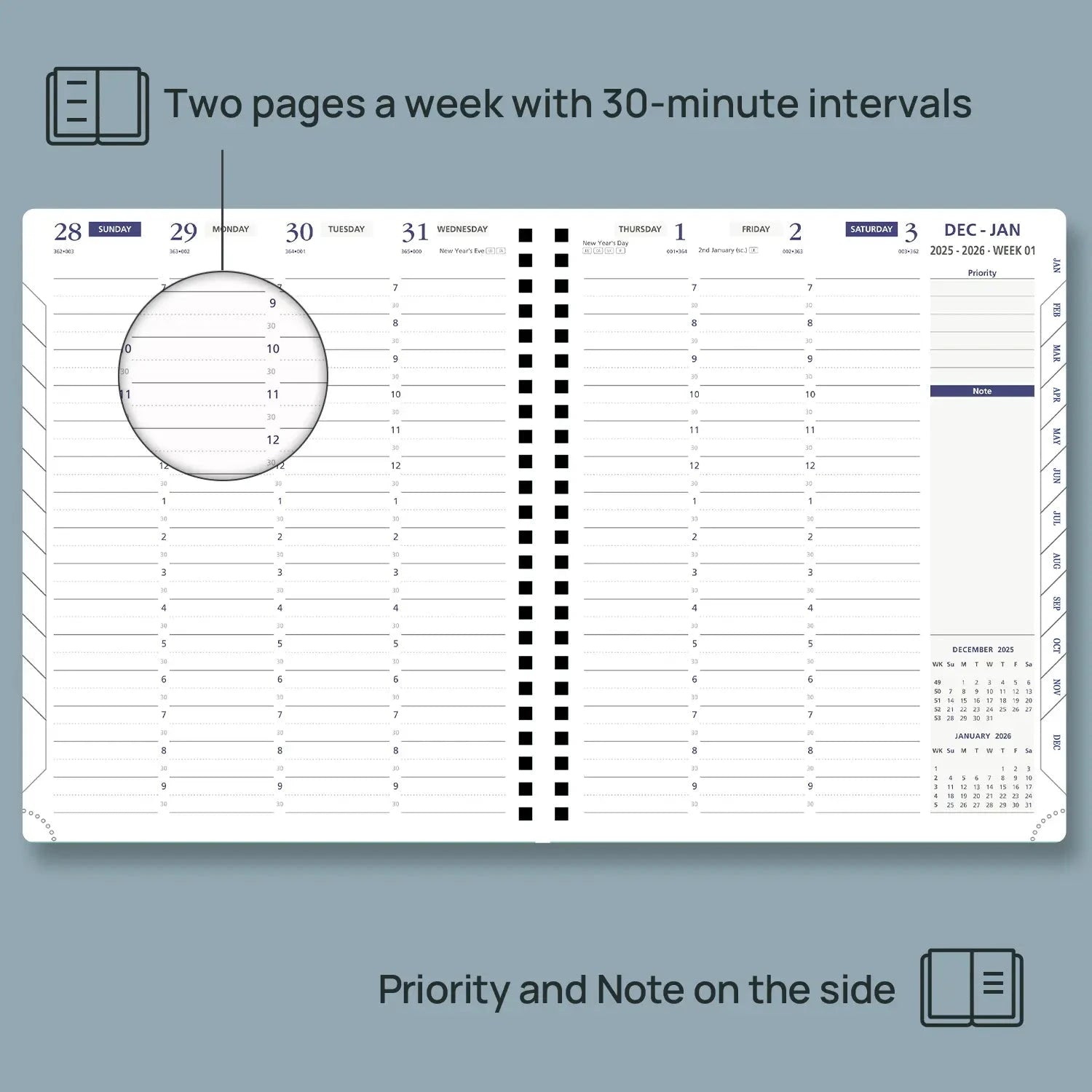 Week-to-view layout across 2 pages with 30-minute appointment intervals – ideal for managing meetings, lessons, or daily routines.